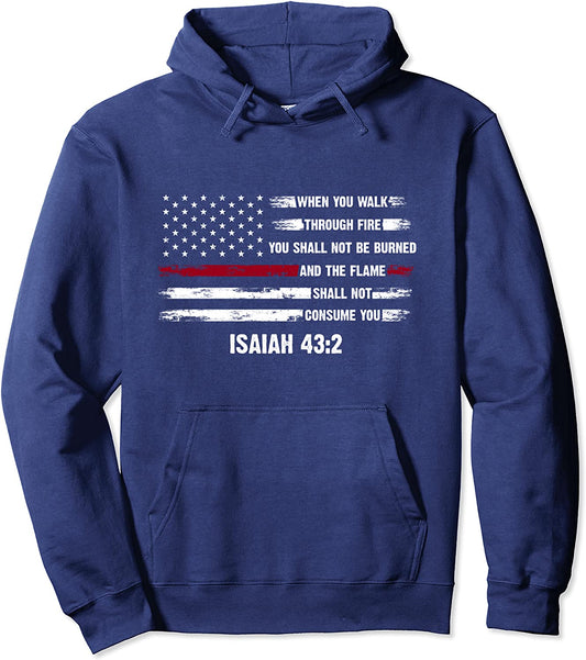 Thin Red Line Firefighter Bible Verse Isaiah 43:2 US Flag Pullover Hoodie