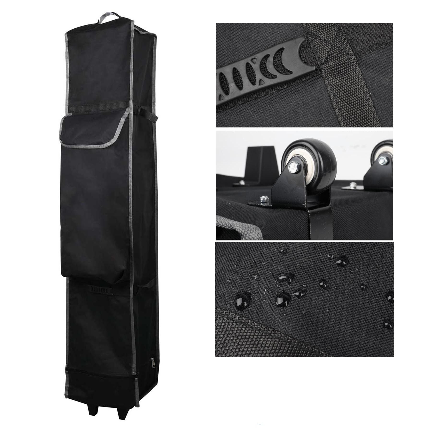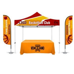 10' x 10' Commercial Grade Steel frame (white powder coated, 1.0mm gauge, and ABS connectors) with the premium wheeled bag. Legs feature automatic push buttons for height adjustments. Canopy with full color dye sublimation printing on 600D PU-coated polyester.